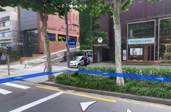 清潭駅9番出口を出て、パク・スンチョルヘアスタジオ清潭店まで500m直進した後、左側の横断歩道を渡ります。