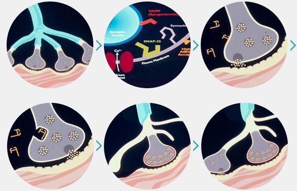 このときボツリヌスクリニックは神経末端内部のタンパク質であるSNAP-25を切断し、これ以上神経末端部位からアセチルコリンを分泌されないようにします。